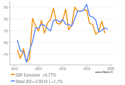 Une fois n’est pas coutume, la publication des PMI (version flash) a surpris positivement. L’indice composite a progressé de 51,5 à 51,8, avec des hausses en Allemagne (+0,5) et en France (+0,8). Le secteur manufacturier allemand reste le gros point noir de la zone (il progresse toutefois de 43,2 à 43,6) mais il est rassurant d’observer que la contagion au secteur des service ne s’est pas manifestée. Si l’on tente de traduire ces chiffres en termes de croissance sous-jacente de l’économie (voir graphe ci-dessus), il apparait qu’ils sont cohérents avec un taux annualisé légèrement supérieur à 1%, ce qui correspond environ à la croissance potentielle. A noter également que la confiance du consommateur s’est bien tenue en juillet.
