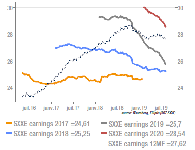 L’année 2019 s’avère être une véritable douche froide pour les anticipations de résultats des entreprises en zone euro, avec 12% de baisse depuis début 2018. Vu d’aujourd’hui, 2019 sera à peine meilleure que 2018, là où une forte croissance était attendue. Notons que l’optimisme initial des analystes permet à l’indicateur à 12 mois d’afficher des baisses beaucoup moins prononcées (au fur et à mesure que le temps passe, la croissance attendue s’intègre progressivement dans l’indicateur composite). Il reste que la baisse des résultats pour cette année et la suivante s’est accélérée récemment. Cela fait craindre une récession effective des earnings pour cette année, un seuil symbolique inquiétant.