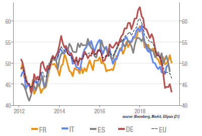 La publication des PMI (en version préliminaire) a été une nouvelle déception pour la zone euro. Le composite a baissé de 0,7, à 51,5 mais c’est l’activité manufacturière et singulièrement l’Allemagne pour lesquelles la situation est la plus préoccupante. Le rebond, que nous attendions depuis la fin de l’année dernière, ne s’est toujours pas manifesté.