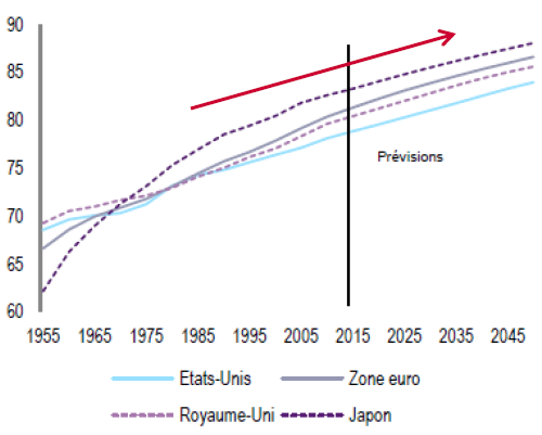 En Zone euro, selon l’ONU, le taux de natalité s’inscrit en repli, passant de dix-huit naissances pour mille habitants en 1955 à neuf en 2025, alors que l’espérance de vie à la naissance progresse fortement, celle-ci atteignant 83 ans en 2025 contre 66 ans en 1955. En d’autres termes, la population vieillit par l’effet conjugué d’un repli de la natalité et d’un allongement de la durée de vie. Les seniors profitent également plus longtemps de leur retraite, l’espérance de vie durant celle-ci ayant atteint vingt-cinq ans en 2015, contre douze ans en 1970.