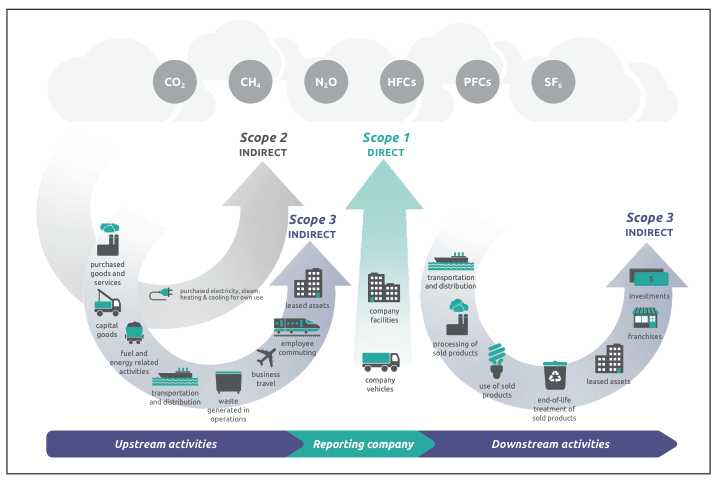 Le Protocole GHG établit une distinction entre les émissions directes et indirectes de gaz à effet de serre. Les émissions directes de gaz à effet de serre sont celles qui proviennent de sources qui appartiennent à la société déclarante en question ou qui sont contrôlées par elle. Les émissions indirectes de GES sont celles qui découlent des activités de l’entreprise déclarante, mais qui proviennent de sources appartenant à une autre entreprise ou partie ou contrôlées par elle. Les trois différents champs d’application des émissions de GES définis plus en détail par le protocole des GES sont les suivants: