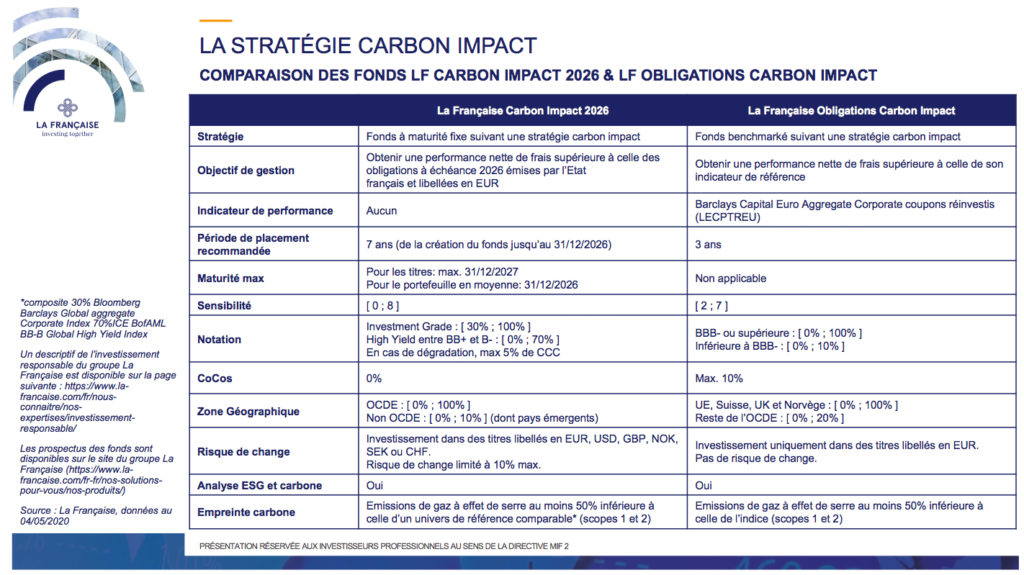 Les informations contenues dans ce document ne sauraient constituer un conseil en investissement, une proposition d’investissement ou une incitation quelconque à opérer sur les marchés financiers. Les appréciations formulées reflètent l’opinion de leurs auteurs à la date de publication et ne constituent pas un engagement contractuel du Groupe La Française. Ces appréciations sont susceptibles d’évoluer sans préavis dans les limites du prospectus qui seul fait foi. Le Groupe La Française ne saurait être tenu responsable, de quelque façon que ce soit, de tout dommage direct ou indirect résultant de l’usage de la présente publication ou des informations qu’elle contient. La présente publication ne peut être reproduite, totalement ou partiellement, diffusée ou distribuée à des tiers, sans l’autorisation écrite préalable du Groupe La Française. www.la-francaise.com