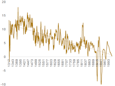 La période de baisse la plus importante fut celle allant de 1379 à 1417 avec une contraction de 58 points de base par an des taux d’intérêts, les taux d’intérêts réels passant ainsi de près de 15% à -6% sur la période.