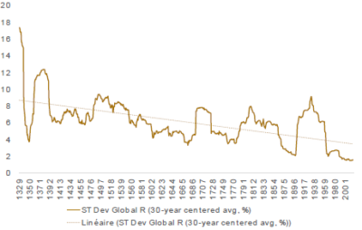 Les fluctuations des taux d’intérêts, ou volatilité, suivent la même tendance baissière. Les taux d’intérêts s’écartent de moins en moins de cette tendance à long terme.