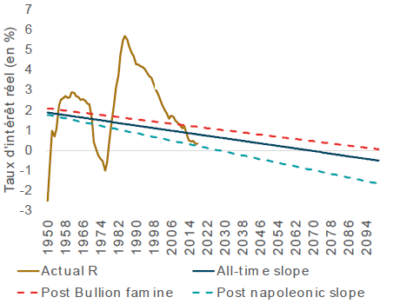 Sur les données long terme préparées par l’auteur, l’évolution des taux d’intérêts permettait d’envisager des taux d’intérêts réels à 0 aux 20ème et 21ème siècle. Trois projections sont utilisées dans le graphique suivant: «all-time slope» représentant la tendance moyenne depuis 1311, «Post-Bullion» soit depuis 1494 et depuis 1820 avec la période «post-napoléonienne». Ces trois projections permettent d’anticiper un niveau de taux réels négatifs à l’horizon 2068 pour la tendance générale. En considérant la période «post-napoléonienne», les taux d’intérêts réels passent en négatifs dès 2027.