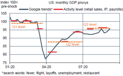 Nous estimons que le niveau d’activité est revenu à 4% sous son niveau pré-pandémie, après être passé par un point bas à -20% en avril. Si l’on reporte ces évolutions dans les comptes trimestriels, on peut s‘attendre à un rebond du PIB réel de l’ordre de 30% t/t en rythme annualisé (après -32% au T2). La distance par rapport au point de départ paraît faible en termes absolus mais c’est peut-être la plus difficile à franchir. Côté demande, les dépenses en biens de consommation sont normalisées, mais ce n’est pas le cas dans de nombreux services (restaurants, voyages). Il faudrait pour réaliser ce rattrapage un progrès décisif sur le front de l’épidémie. Du côté de l’offre, il est difficile de stimuler le cycle de l’investissement vu les incertitudes des prochains mois dans les domaines sanitaire et politique. Qu’on songe à un secteur comme le shale oil, qui sortait juste de convalescence (contre-choc pétrolier de 2015) quand le virus est apparu. Sa contribution aux dépenses en biens capitaux va rester déprimée.