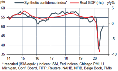 Au début de l’été, la résurgence de l’épidémie de coronavirus avait fait craindre que la reprise de l’économie US s’arrête après seulement deux mois1. Les indices de mobilité des personnes tendaient à s’effriter. L’arrêt programmé à la fin juillet de l’allocation exceptionnelle versée aux chômeurs renforçait ce risque, d’autant que les deux partis du Congrès n’étaient pas d’accord pour voter une nouvelle impulsion budgétaire (sur ce point, il n’y a pas eu de progrès). L’été est passé. La reprise économique s’est en réalité poursuivie, mais à un rythme ralenti. Notre proxy mensuel du PIB a gagné environ 7% en mai et juin, 2% en juillet et 0.8% en août (graphe du haut). Les indicateurs à haute fréquence disponibles pour septembre ne présagent pas une chute soudaine. Les indices de confiance, qui donnent un signal un peu avancé, ont d’ailleurs continué de se redresser (graphe du bas).