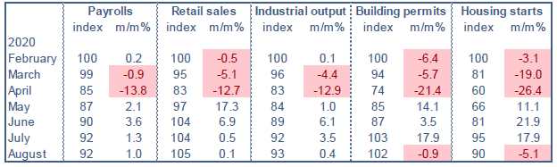 Emploi, industrie, ventes au détail, toutes ces données confirment que la reprise s’est poursuivie en août mais à un rythme ralenti par rapport aux mois précédents (tableau). La production industrielle est 7% sous son niveau pré-pandémie. Les ventes au détail ont dépassé ce niveau sauf pour trois catégories de dépenses : restaurants (-16% depuis février), magasins de vêtements (-20%), stations-service (-15%). Le rebond de la construction résidentielle marque le pas, mais le boom de ce secteur, alimenté par les taux bas, n’est pas remis en cause.