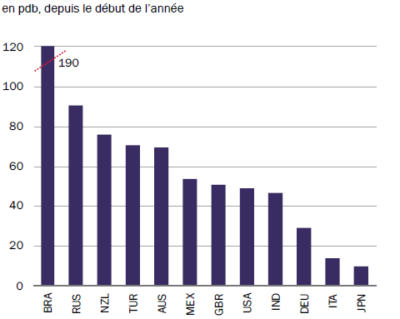 La récente hausse des taux américains s’ajoute également à la tendance enclenchée dans certains pays émergents, en particulier pour les économies à haut rendement comme la Russie, la Turquie et l’Afrique du Sud. La Banque centrale russe a laissé entendre qu’elle pourrait augmenter son taux directeur cette année, tandis que les réserves obligatoires en Turquie ont été relevées de 200 points de base en réponse au récent resserrement des conditions du marché mondial qui complique le financement d’un pays ayant un large déficit au compte courant. La hausse des taux d’intérêt des pays émergents a également été exacerbée par les inquiétudes suscitées par le souvenir de l’instabilité financière survenue lors du taper tantrum1 de 2013, bien que les pays émergents ne soient probablement pas aussi vulnérables, en partie à cause de déséquilibres extérieurs moins prononcés.