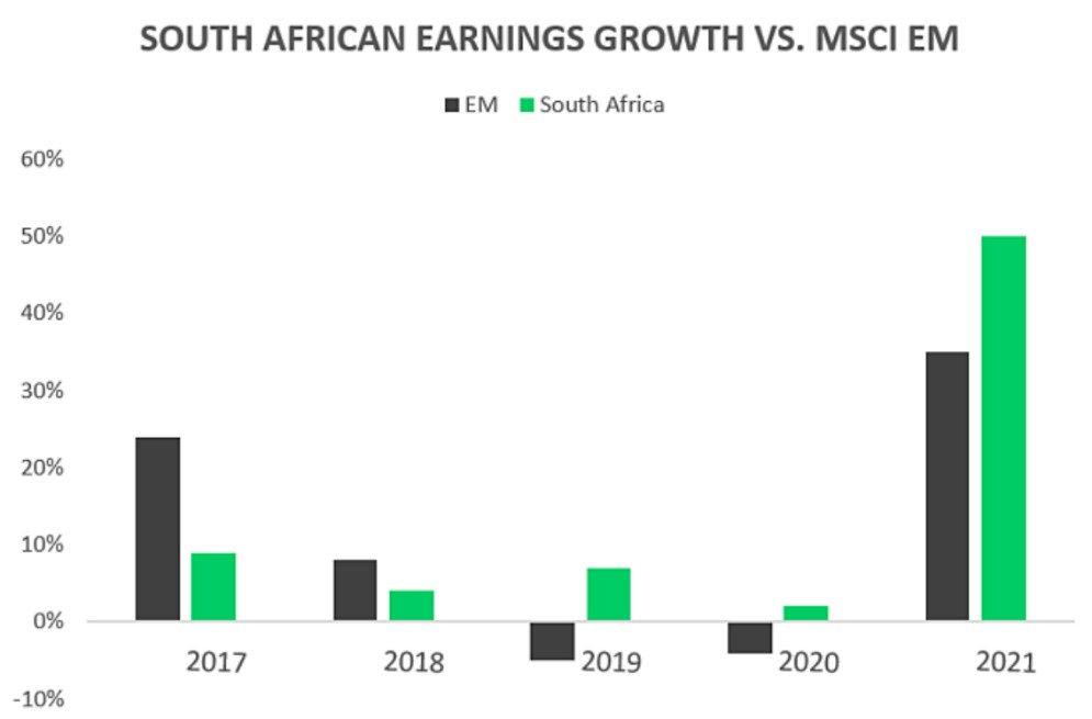 L’importante influence de Naspers transparaît également dans la croissance des bénéfices agrégés de l’indice Sud-Africain. Comme nous pouvons le constater dans le graphique ci-dessous, les bénéfices ont nettement mieux résisté en 2020 que dans le reste des pays émergents grâce notamment à la résilience du modèle d’affaires de Naspers. En 2021, la croissance bénéficiaire des actions sud-africaines devrait une nouvelle fois surperformer l’ensemble des pays émergents grâce au rebond des matières premières et notamment celui des mines d’or. La prime d’évaluation du MSCI South Africa par rapport au MSCI Emerging Markets paraît donc justifiée.
