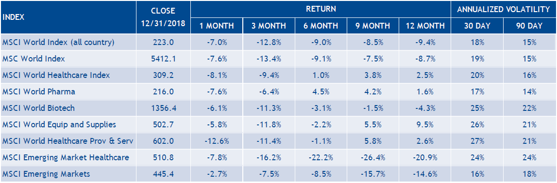Malgré un début d’année convenable, 2018 s’est terminée sur une note très négative. Au cours du dernier trimestre, les marchés des pays développés ont chuté de 12,8 % (MSCI World AC), tandis que les marchés émergents ont perdu 7,5 %. En recul de 9,4 % sur les marchés développés, le secteur de la santé ne s’est guère révélé défensif, tandis que sur les marchés émergents, la situation était encore pire, puisqu’il a perdu 16,2 %. Les entreprises de petite et moyenne capitalisations du secteur de la santé (-25,6 %) et des biotechnologies (-20,5 %, indice Nasdaq Biotech) ont été les plus pénalisées. Les entreprises pharmaceutiques (-6,4 %) ont, en revanche, mieux résisté, tandis que les technologies médicales et les services ont avancé à tâtons entre ces deux extrêmes.