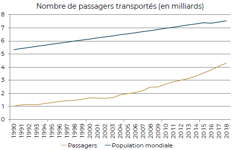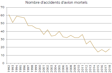 Le traffic passager bénéficie d’une offre élevée, avec le développement des compagnies low cost et d’une sureté supérieure à d’autres moyens de transports. Le nombre d’accidents mortels en avion a légèrement progressé en 2018 mais reste sur une dynamique d’amélioration continue et ce, malgré le nombre de vols et de passagers en constante augmentation. La baisse serait encore plus importante si elle était présentée en fonction du nombre de passagers transportés.