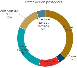 L’Europe reste le plus grand marché. Avec près de 38% du traffic, exprimé généralement en passagers kilomètres payants (PKP), c’est la première région d’exploitation des compagnies aériennes. L’Asie représente 28% alors que le Moyen-Orient talonne l’Amérique du nord. En 2018 la croissance asiatique et européenne sont les principaux catalyseurs de l’expansion du secteur.