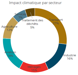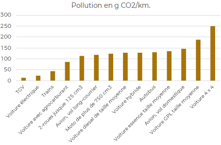 L’avion reste un mode de transport très polluant et responsable de 18% des émissions polluantes. Et pourtant les taxes sur les carburants y sont inexistantes! Le transport aérien de courte distance est d’ailleurs beaucoup plus polluant qu’un transport long courrier. Un vol domestique affiche un taux de pollution de 145 g de CO2 par km contre 118 pour un long courrier, soit 23% de plus.
