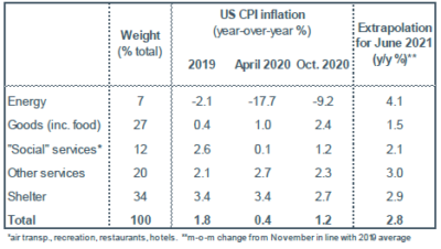 Quelles sont les implications d’un tel scénario? Du côté de l’offre, un vaccin efficace lèverait des contraintes bridant la production, notamment sous la forme d’une hausse des effectifs. Pour rappel, en octobre, le nombre d’employés était 10 millions sous son niveau de février. Du côté de la demande, on peut s’attendre à ce que l’épargne accumulée soit plus vite dépensée. Le taux d’épargne pointait en octobre 6 points au-dessus du niveau de février. L’ajustement de la demande sera sans doute plus rapide que celui de l’offre, entraînant des tensions de prix. Notons de plus que les effets de base vont pousser l’inflation à la hausse. Pour chacune des grandes composantes de prix, en extrapolant les évolutions constatées en 2019, on s’acheminerait vers une inflation à 2.8% sur un an en juin 2021, vs 1.2% actuellement (tableau). En tout état de cause, la cible de la Fed serait bel et bien dépassée.