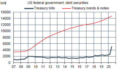 Reste à examiner la question budgétaire. En 2020, le déficit du budget fédéral a inscrit un record à 15% du PIB. Il a surtout été couvert par une dette à court terme, de sorte que la part des titres à long terme est inférieure à la normale (graphe). Ce n’est pas a priori une situation propice à une envolée des taux. Toutefois, si les déficits restent élevés à l’avenir, il faudra absorber plus d’émissions de titres. La Fed dispose ici d’une marge d’action pour influencer les taux longs. Même si elle ne suit pas au sens strict une politique de « yield curve control », il serait étonnant qu’elle tolère sans réagir une forte hausse des taux. La stabilité financière et l’accès au crédit risqueraient d’en pâtir, à rebours du mandat de la banque centrale.