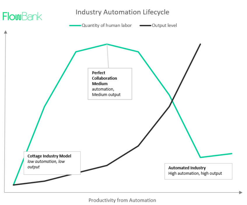 L’introduction de machines industrielles, qui ont permis d’augmenter le taux de croissance de l’économie, fût accompagnée d’un besoin croissant de main d’œuvre – et non le contraire. Certes, plus le niveau d’automatisation s’accroît et plus le niveau de production augmente, moins l’implication humaine est nécessaire. Mais les excédents de rendements créés grâce à l’automatisation sont idéalement réinvestis dans l’économie, ce qui a pour effet d’augmenter la demande de main d’œuvre.