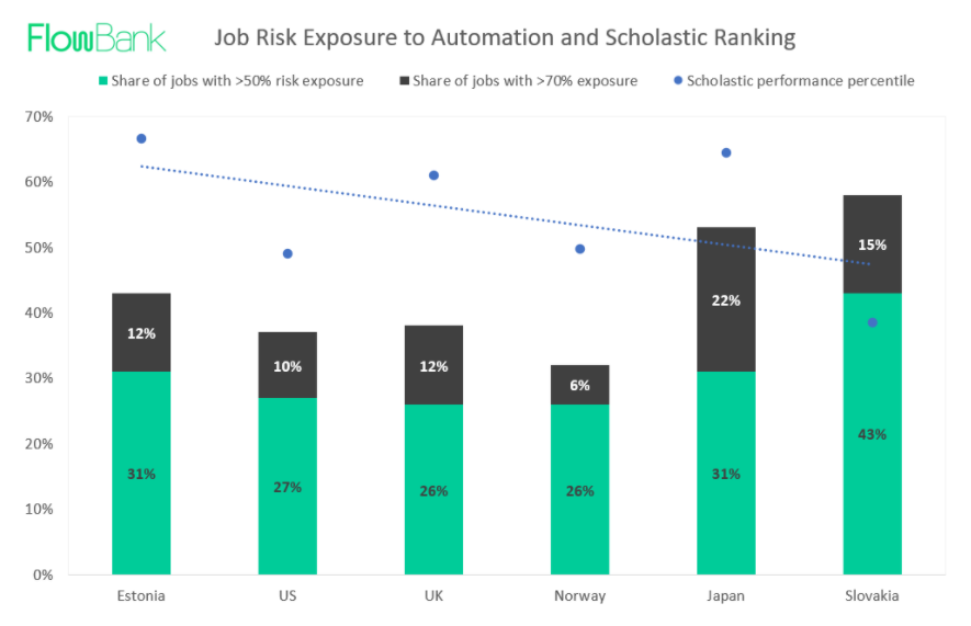 Les recherches suggèrent que les pays ayant des scores plus faibles en STIM (science, technologie, ingénierie et mathématiques) seront davantage impactés par l’automatisation, car les nouveaux emplois créés exigeront des travailleurs plus hautement qualifiés. Par exemple, l’Estonie, qui se situe en tête du classement par percentile des performances scolaires, devrait voir 31% de ses emplois exposés à 50% au risque d’automatisation, et 12% des emplois exposés à 70%. En d’autres termes, même les pays qui sont déjà bien positionnés dans les métiers liés aux STIM pourraient être affectés par l’automatisation si la division entre travail et capital leur est défavorable.