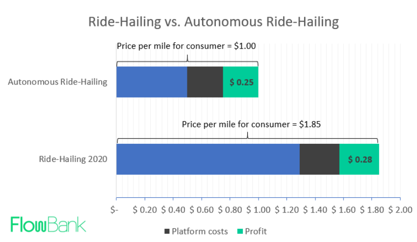 Les «taxis robots» devrait sans doute étendre le marché du transport individuel grâce à l’arrivée des véhicules autonomes. Selon une étude d’Ark Invest, corrigé de l’inflation, le coût de possession et d’utilisation d’une voiture personnelle n’a pas changé depuis les années 30. D’ici 2025, le coût des taxis autonomes pourrait bousculer le statuquo. Le marché des taxis «traditionnels» génère aujourd’hui 150 milliards de dollars de revenus dans le monde entier et le prix du kilomètre pour les consommateurs est de 1,85 $, avec des bénéfices réalisés par les sociétés de transports de 0,28 $ par mile. L’arrivée des véhicules autonomes devrait permettre aux sociétés de transport de maintenir quasiment la même marge bénéficiaire (0,25 $ par mile) alors que le prix payé par les consommateurs sera considérablement réduit à environ 1 $ par mile.