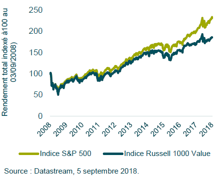 Mais du point de vue des investisseurs «value», ce cycle haussier est clairement baissier – ce qui est également assez remarquable. Le style «value» est délaissé depuis la crise financière, bien qu’il soit brièvement revenu sur le devant de la scène en 2016. Durant cette période, les titres «value» (représentés par l’indice Russell 1000 Value) ont nettement sous-performé le marché (voir le graphique 1).