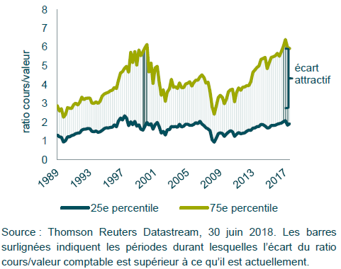Les facteurs qui ont contribué à la sous-performance durable des titres «value», que nous avons surlignés ci-dessus, ont également conduit à un écart de valorisation significatif entre les actions les moins chères et les plus chères du marché (voir graphique 3).