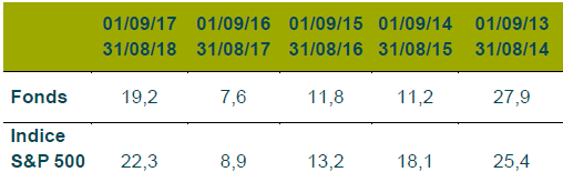 Entre début septembre 2013 et fin août 2018, le fonds a généré une performance de 15,3 % par an (part A de capitalisation en euro, de valeur liquidative à valeur liquidative, revenus nets réinvestis). Bien qu’elle soit inférieure à celle de l’indice S&P 500 (17,4 % par an), nous considérons ce résultat comme encourageant étant donné les difficultés considérables auxquelles nous avons été confrontés en tant qu’investisseurs «value». Pour replacer les choses dans leur contexte, l’indice Russell 1000 Value a enregistré une performance de 14,0% par an sur la même période.