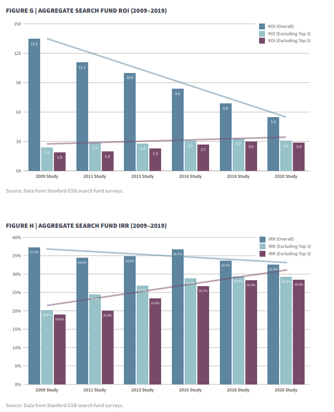 Une étude de la Graduate School of Stanford Business montre qu’en 2019, les «search funds» aux États-Unis et au Canada ont constitué l’une des classes d’actifs les plus performantes en termes de rendement, avec un TRI (taux de rendement interne) avant impôt de 32,6% et un retour sur investissement de 5,5x. Il faut toutefois garder en tête que ces chiffres sont biaisés par la performance exceptionnelle des 5 fonds les plus performants. Quoi qu’il en soit, ces statistiques sont bien meilleures que pour l’ensemble de l’industrie du capital risque.
