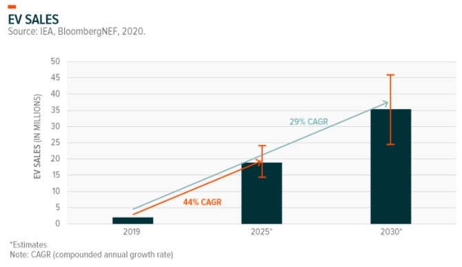 Certes, l’offre de lithium au niveau mondial reste excédentaire mais certains analystes pensent qu’une hausse de la demande pourrait bientôt rééquilibrer la balance, comme le suggère la lente augmentation des prix du lithium au début de cette année. L’adoption mondiale des VE a augmenté avec des ventes en hausse de 43% par rapport à l’année précédente, pour un total de 3,24 millions de voitures vendues. L’Europe a été le principal moteur de cette croissance, dépassant la Chine pour la première fois en cinq ans. Le taux de croissance annualisé des ventes de VE pourrait être de l’ordre de 44% jusqu’à 2025 et de 29% entre 2025 et 2030, comme nous pouvons le voir sur le graphique ci-dessous. Les gouvernements des pays développés exercent une pression importante sur la réalisation des objectifs environnementaux d’ici 2030. Ainsi, le Royaume-Uni prévoit d’investir près de 3 milliards de livres sterling dans la production de VE au cours de la prochaine décennie afin d’atteindre ses objectifs.
