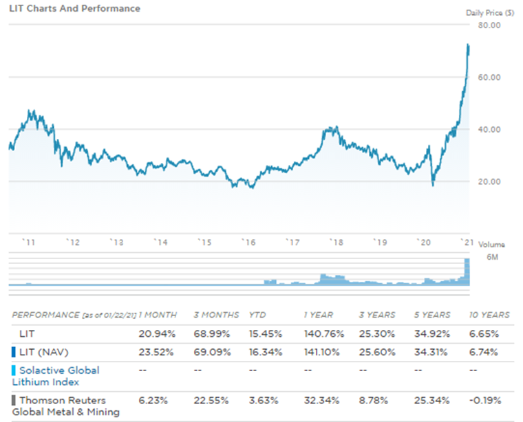 En revanche, il est possible d’investir dans les titres liés à ce métal. Il existe même un ETF, le Global X Lithium & Battery Tech ETF (ticker : LIT). Le fonds réplique l’indice Solactive Global Lithium Index. La capitalisation boursière est proche des 3 milliards. La performance de cet ETF lors des 12 derniers mois est d’ailleurs remarquable (cf. ci-dessous). On observe une forte corrélation avec les titres faisant partie de la thématique des véhicules électriques.