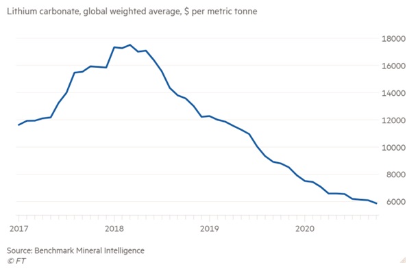 La production mondiale de lithium en 2019 a ainsi diminué de 19%, passant de 95 000 tonnes pour 2018 à 77 000 tonnes de lithium. La consommation industrielle en 2019 fût alors plus faible que prévue, en raison de la réduction des subventions chinoises sur les voitures électriques, de la diminution des stocks par les consommateurs et du fait que les volumes de vente de véhicules électriques étaient inférieurs aux prévisions. Mais en 2020, la consommation mondiale de lithium a nettement rebondi avec une progression de 18%.