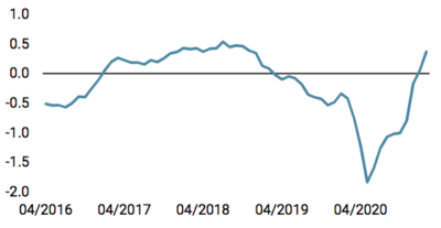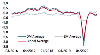 La situation économique est aujourd’hui moins rose qu’elle ne l’était à la fin de l’année dernière en raison de la reprise des mesures de confinement visant à contenir la deuxième vague de la pandémie. Nos Nowcasters de croissance ont atteint un sommet en termes de niveau et d’indices de diffusion entre novembre et décembre 2020, et n’ont cessé de baisser depuis lors pour les économies développées. La proportion de données macroéconomiques en amélioration est tombée à 50% en Europe et à 40% en Amérique du Nord et au Japon, avant de se stabiliser autour de ces niveaux. Néanmoins, nous pensons que ce ralentissement ne sera que temporaire, car la campagne de vaccination augmente les chances de réduire les mesures d’endiguement et renforce notre confiance dans une reprise macroéconomique complète d’ici la fin de l’année.