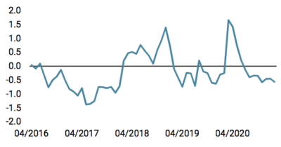 Le sentiment et le momentum des actifs à risque ont poursuivi leur rapide ascension en 2021 mais semblent maintenant extrêmes. De nombreux indices ont atteint des records, les niveaux de liquidités détenus par les investisseurs de fonds de pension ont atteint des creux historiques tandis que les segments plus risqués et plus spéculatifs qui avaient été négligés l’année dernière ont été favorisés cette année. Pour l’indice HY, la différence entre les spreads corrigés des options sur les titres américains notés CCC et B s’est resserrée à des niveaux historiquement bas: moins de 200 points de base. Au niveau sectoriel, les spreads dans le secteur de l’énergie ont fortement surperformé, se resserrant de 96bps depuis la fin de 2020, par rapport aux secteurs cycliques et industriels, qui se sont respectivement élargis de 30bps et de 5bps. Le positionnement dans les indices synthétiques, bien que moins extrême qu’il y a un mois, reste proche des sommets historiques, à la fois sur les marchés «investment grade» (IG) et HY. Les stratégies de «trend following» détiennent désormais des positions longues substantielles dans la classe d’actifs, compte tenu du momentum observé depuis le début de la reprise au deuxième trimestre 2020.