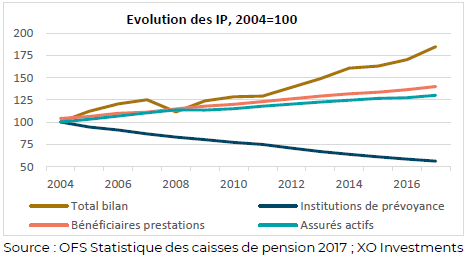 La tendance de ces dernières années est claire comme le montre le graphique. Le total du bilan est en nette augmentation, mais cela se couple avec une baisse massive du nombre d’institutions de prévoyance qui deviennent donc plus grandes par effet de rapprochement.