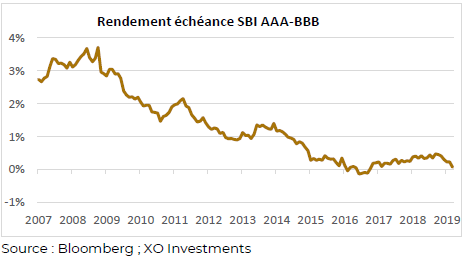 L’autre élément d’influence est la rentabilité espérée des placements, qui dépend évidemment du niveau des taux d’intérêts. Plus ils sont faibles, moins on espérera encaisser de rendement. C’est la problématique actuelle avec un rendement à échéance de l’indice obligataire suisse qui atteint péniblement 0.10% aujourd’hui ! La rentabilité espérée est intimement liée à la notion de taux technique.