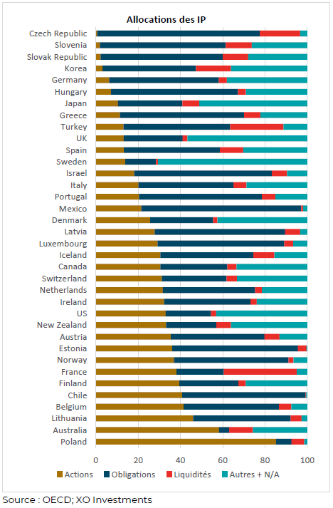 Les différents systèmes de prévoyance dans le monde ne traitent pas ces problématiques de la même manière. Dans la majeure partie des cas, les caisses étrangères adoptent des stratégies plus agressives (plus d’actions, plus d’actifs réels ou de stratégies alternatives) pour augmenter le rendement.