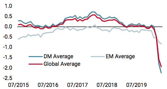 Les macro-indicateurs se sont effondrés à l’échelle mondiale, reflétant la brusque mise en œuvre du confinement et de l’inactivité économique dans le monde entier. Le marché a été témoin de variations dans les séries macroéconomiques sans précédent. Parmi ces variations extraordinaires, la plus emblématique est probablement l’augmentation des demandes d’allocations chômage aux États-Unis, qui sont passées d’une moyenne de plus de 200 000 par semaine à un pic de 6,9 millions le 27 mars. Vendredi dernier, le taux de chômage aux États-Unis a atteint 14,7%: soit un total de 20 millions de personnes sans emploi, bien que temporairement pour certaines d’entre elles. Cette détérioration des données macroéconomiques a rapidement conduit nos Nowcasters de croissance à refléter un monde en pleine récession, déclenchée par des mesures de confinement. Dans le cas des États-Unis, elle a atteint -2,3 écarts-types, la zone euro et le Royaume-Uni affichant des niveaux similaires, tandis que la Chine, la Thaïlande et la Corée du Sud restent dans la zone de -1 à -1,5. Personne ne peut contester le message véhiculé par ces chiffres : le choc que nous subissons actuellement est extrêmement grave.