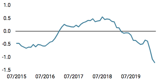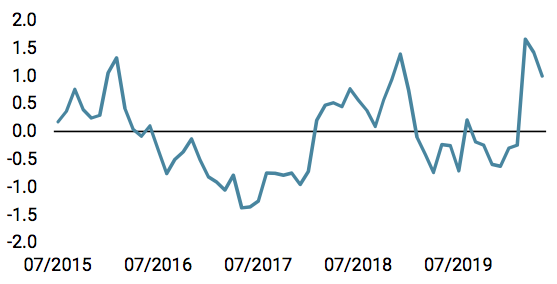 - Ensuite, nous examinons si les données macroéconomiques publiées surprennent les économistes tant à la hausse qu’à la baisse. En période de détérioration, les économistes sont généralement surpris à la baisse. Lorsque cette détérioration commence à ralentir, les surprises ont tendance à être plus équilibrées, comme ce fut le cas à la fin des quatre dernières périodes de chocs macroéconomiques (2001, 2008, 2011 et 2015). Parmi les indices «surprises» du G10, 45% sont actuellement en amélioration. Là encore, un signe de stabilisation apparaît, puisque ce chiffre était de 38% il y a deux semaines.