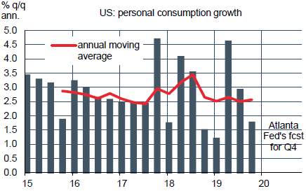 Depuis un an, le ralentissement de la croissance américaine est dû aux des dépenses des entreprises. La consommation des ménages est volatile à court terme autour d’une tendance solide. Cette année encore, il semble y avoir une saisonnalité résiduelle avec un fort dynamisme au T2/T3 faisant suite au coup de mou au T4/T1. De ce fait, il faudra interpréter avec prudence un ralentissement de la consommation dans les prochains mois. La Fed d’Atlanta ne prévoit qu’une hausse des dépenses personnelles de +1.7% (annualisé) au T4. Mais ces à-coup mis à part, la tendance de la consommation est assez stable depuis 2015 (graphe). Cela reflète une hausse solide des revenus et un niveau de confiance élevé. Que peut-on dire sur la confiance justement?