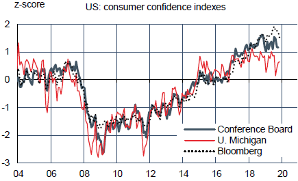 Alors que l’incertitude pousse les entreprises à réduire leurs dépenses, les ménages américains consomment à un rythme constant. Cette stabilité ancre la croissance totale et traduit la progression des revenus, en particulier ceux du travail. Mais elle s'explique aussi par un haut niveau de confiance, revenu à ses niveaux pré-crise financière. Plus de confiance, cela permet de mieux lisser les revenus en jouant sur l’épargne et le crédit. Pour autant, les ménages sont moins optimistes sur les conditions futures qu’à la fin des années 1990. C’est le gage d’une certaine prudence, et cela minimise le risque de correction.