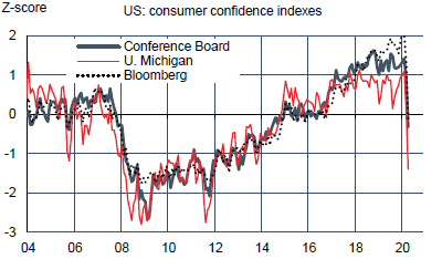 Avant l’épidémie de coronavirus, la confiance des ménages était très élevée. Rien que de très normal dans une économie au plein-emploi et avec des gains importants sur la richesse. Désormais, le taux de chômage officiel avoisine 15%, mais d’autres mesures, peut-être plus représentatives, dépassent 20%. La confiance des ménages a certes plongé en quelques semaines, mais reste loin de ses points bas de la crise financière de 2008 (graphe). Il est tentant d’y voir un point encourageant pour l’évolution future de la consommation, quand l’économie aura été déconfinée.