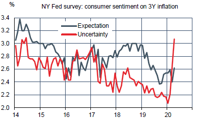 Ces soutiens au revenu sont transitoires. Le bonus de 600$ par semaine n’est censé durer par exemple que jusqu’en juillet. On serait étonné que d’ici là les États-Unis aient miraculeusement restauré 20 millions d’emplois. L’ardeur de certains à rouvrir l’économie au plus tôt est peut-être motivée par le désir de stopper ces mécanismes coûteux. En somme, la crise actuelle n’a pas (encore) totalement déprimé les ménages mais elle a sans conteste accru l’incertitude. En avril, l’enquête de la Fed de New York après des ménages montre qu’ils sont beaucoup plus indécis sur l’évolution future de l’inflation (graphe). Ils n’ont pas tranché le débat inflation/déflation.