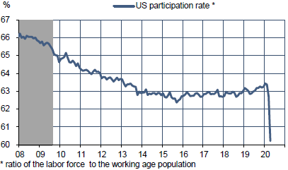 En avril, le taux de chômage a bondi de 4.4% à 14.8% de la population active, soit une hausse du nombre de chômeurs approchant 16 millions. Dans sa note méthodologique, le Bureau of Labor Statistics ne cache pas que ce chiffre est très imprécis et susceptible d’être révisé par la suite. Tout d’abord, le taux de réponse à l’enquête auprès des ménages n’a été que de 70% alors qu’il est d’habitude de 85% environ. Ensuite, du fait des circonstances exceptionnelles, le BLS a dû modifier la manière de redresser les chiffres d’emploi résultant de la démographie des entreprises (Birth-Death Model). Enfin, des nombreux travailleurs ont été considérés comme employés (et non chômeurs ou hors de la population active) bien qu’ils aient été absents de leur postes au moment de l’enquête. Si on les ajoutait au nombre de chômeurs, le taux de chômage serait 5 points plus haut, soit presque à 20%. En somme, à quelques millions près, on ne sait pas trop si les personnes ont été rangées dans les bonnes cases. Le choc sur l’économie réelle est, quoi qu’il en soit, d’une amplitude inégalée. Le taux de participation perd en outre plus de trois points (graphe). Pour la huitième semaine de suite les inscriptions au chômage se chiffrent en millions (2.9).