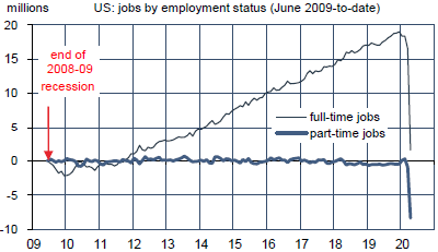 L’enquête du BLS auprès des entreprises estime les destructions nettes d’emploi à 20.5 millions au total. Aucun type d’emploi (graphe) ni aucun secteur, il va sans dire, n’est épargné. L’emploi baisse de 15% dans la construction, de 12% dans le secteur manufacturier, de 16% dans le commerce de détail, de 12% dans l’éducation, de 14% dans la santé, de 9% dans le secteur public. Dans la restauration et les loisirs, l’emploi baisse de 47% (7.6 millions) avec un taux de chômage qui grimpe à près de 45%.