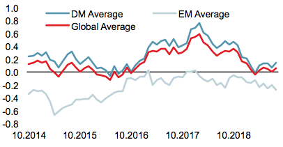 Jusqu’à présent, 2019 a été une très bonne année pour à peu près toutes les classes d’actifs. Au cours des 100 dernières années, ce n’est qu’une fois en 1986 que les actions (+ 18%), les obligations à long terme (+ 25%) et l’or (+ 22%) ont toutes les trois progressé de 15% ou plus la même année. À la fin de 1985 et au début de 1986, l’économie des États-Unis est passée d’une reprise rapide après la récession du début des années 80 à une expansion plus lente. Les mesures de politique monétaire accommodantes prises par la Réserve fédérale en 1986 (elle a ramené le taux cible de 8% à 5,875%) ont été influencées par des signes de faible croissance économique et d’inflation modérée. Malgré de nombreuses différences macroéconomiques entre les années 80 et aujourd’hui, nos font état d’un environnement économique similaire dans lequel la croissance mondiale continue de ralentir et où l’inflation surprend à la baisse, permettant aux banques centrales de rester dovish. Les dix dernières années de mesures de relance monétaire ont créé un «rallye généralisé» fortement corrélé. C’est dans cet esprit que les investisseurs tentent de devancer les banques centrales, dont on attend qu’elles fassent « plus ou moins la même chose ».