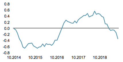 S’il devait y avoir une récession, ce serait la récession la plus télégraphiée de l’histoire, car tous les investisseurs s’y préparent. Les recherches de Google sur le terme «récession» ont atteint des niveaux jamais vus depuis la crise financière, principalement en raison de l’un des indicateurs les plus fiables, l’inversion de la courbe des taux, indique une récession économique. Nous accordons une attention particulière aux signaux fournis par les courbes de taux, mais une inversion n’est pas en soi une raison pour réduire les actifs de croissance. Premièrement, lorsque les taux obligataires à long terme tombent sous les taux à court terme, il faut en moyenne 12 mois avant que la récession n’arrive. Cette période est normalement extrêmement bonne pour les actifs de croissance. Deuxièmement, au cours de cette première phase, nous interprétons l’inversion comme un indicateur révélateur du sentiment négatif du marché. Un autre indicateur de sentiment dénotant le caractère «excessif» des marchés financiers est la forte corrélation récente entre les actifs de couverture, qui indique une forte concentration dans les positions défensives.