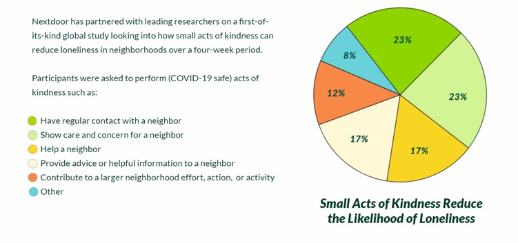 Afin de comprendre les besoins des clients et de créer un modèle commercial performant, Nextdoor s’est associé à des chercheurs de premier rang pour réaliser une étude de marché. Voici quelques-unes de leurs conclusions: 75% des clients cibles prévoient d’acheter local, 80% s’attendent à travailler depuis leur domicile au moins 3 fois par semaine, 73% déclarent que les voisins sont l’une des communautés les plus importantes dans leur vie et le fait de connaître au moins 6 voisins peut réduire la solitude. Tous les points susmentionnés peuvent laisser présager des opportunités de croissance pour la plateforme Nextdoor. Le graphique ci-dessous résume les résultats de l’enquête sur la solitude du voisinage.