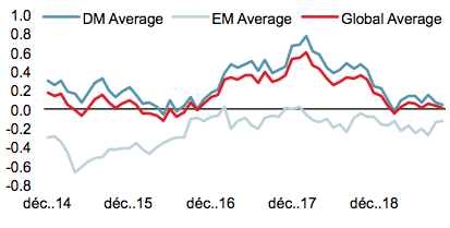 Le risque est multidimensionnel et, outre les risques macroéconomiques, nous surveillons le sentiment et les valorisations du marché qui influent également sur les rendements des actifs à court- et à moyen terme. Pour ces deux dimensions, le tableau d’ensemble est plus mitigé. Du côté des investisseurs, la confiance a été affectée par le flot d’informations négatives sur le risque de destitution du président américain et par les situations non résolues entourant la guerre commerciale et Brexit. Ceci a déclenché le récent mouvement d’aversion au risque et continuera de peser sur le marché dans les mois à venir. A nos yeux, le pire des scénarios se caractérise par un cercle vicieux alimenté par la panique financière qui gèlerait toute décision d’investissement de la part des entreprises et des ménages.