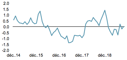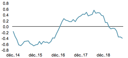 Pour la deuxième fois d’affilée, l’ISM manufacturier est tombé sous le seuil des 50, ce qui souligne historiquement un ralentissement de l’économie. C’est la première fois depuis fin 2015 que cette situation se produit. La situation s’était améliorée en 2016 grâce au report de la normalisation de la politique monétaire de la Fed. Aujourd’hui, dans un contexte d’inversion des courbes de taux, de fort ralentissement du commerce mondial et d’incertitudes accrues concernant la guerre commerciale, la situation politique américaine et Brexit, cette dynamique macro-économique négative a entraîné une hausse du «pricing» de récession.