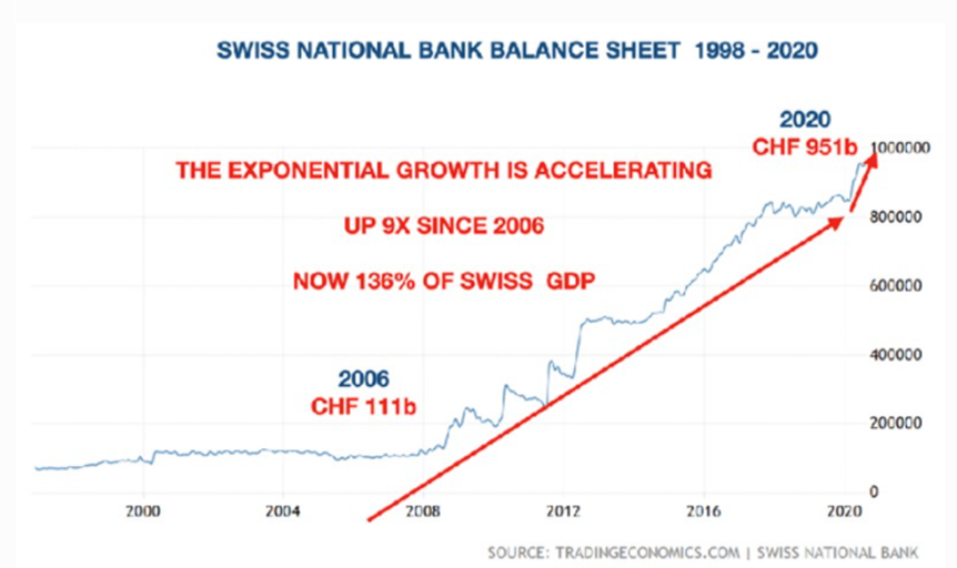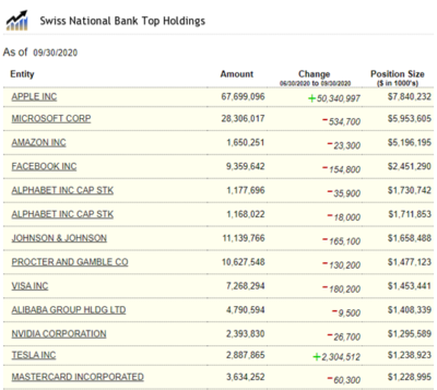 N’oublions pas que la Banque nationale suisse est également l’un des plus grands propriétaires étrangers d’actifs américains. Les Suisses ont des réserves de change d’une valeur d’un près d’un trillion de francs, dont un tiers environ est libellé en dollars américains. La BNS investit également dans des actifs américains aussi divers que des actions technologiques, contrairement aux autres banques centrales qui ne détiennent généralement que de l’or et des devises étrangères en réserve. Comme le montre le tableau ci-dessous, la BNS détenait au 30 septembre pour près de 8 milliards de dollars d’actions Apple, près de 6 milliards de Microsoft ou encore $1.2 milliards de Tesla… L’expansion du bilan de la BNS a bénéficié d’une certaine façon au marché d’actions américaines – la BNS est d’ailleurs perçue par certains comme le plus gros fonds spéculatif de la planète…