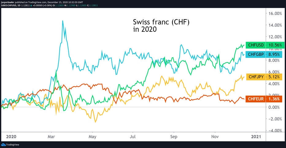 La Suisse pourrait également bénéficier de circonstances atténuantes cette année, car la pandémie a poussé les investisseurs vers les devises refuges, un impact que l’on a également pu observer sur le yen japonais.